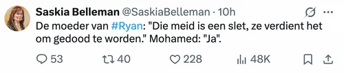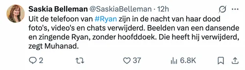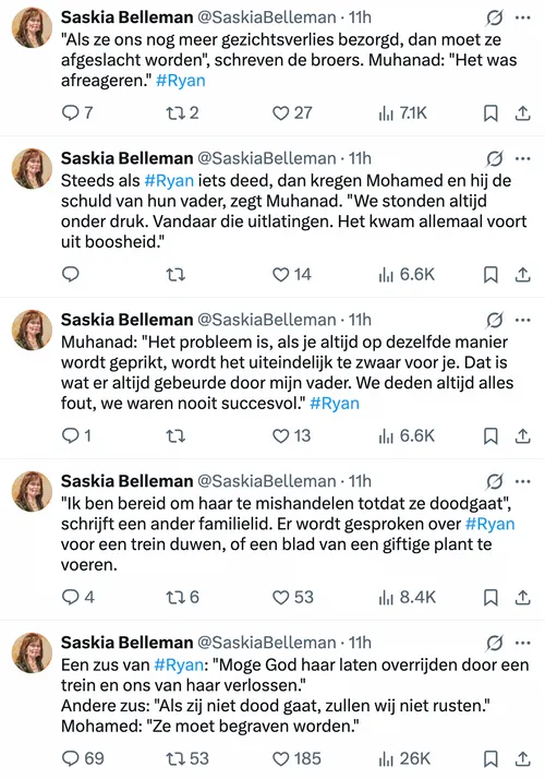 Het zijn details die je maag doen omdraaien en die opnieuw bewijzen dat we in Nederland te maken hebben met een import-cultuur die haaks staat op alles wat wij beschaafd noemen. De 18-jarige Ryan al N. is in mei 2024 op gruwelijke wijze om het leven gebracht. Haar 'misdaad'? Ze wilde leven als een vrije jonge vrouw, zonder hoofddoek, zingend en dansend. Voor haar Syrische familie was dat reden genoeg voor een doodvonnis. Uit de rechtszaak die gisteren begon in Lelystad, en uit de tweets van rechtbankverslaggever Saskia Belleman, blijkt dat het hele gezin doordrenkt was van een zieke, moorddadige haat tegen hun eigen vlees en bloed.
