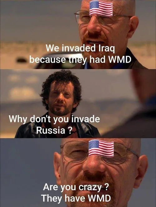 Het is werkelijk lachwekkend hoe pijnlijk doorzichtig deze westerse strategie inmiddels is geworden. De hilarische internetmeme van de hitserie Breaking Bad vat de ultieme hypocrisie van deze Amerikaanse buitenlandpolitiek perfect samen. We vielen destijds Irak massaal binnen met het absolute non-argument dat zij gevaarlijke massavernietigingswapens zouden bezitten, terwijl dat land eigenlijk volkomen weerloos was.