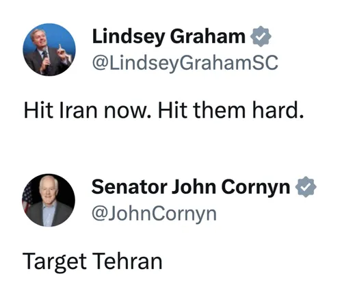 De totaal gestoorde neoconservatieven van de Republikeinse Partij in de Amerikaanse Senaat willen harde actie tegen Iran. Zo zegt de volgens velen overduidelijk homofiele (maar in de kast) senator Lindsey Graham dat Iran gebombardeerd moet worden. "Hard." De Democraten en de Republikeinen hebben in