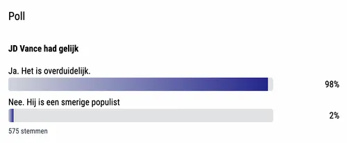 de stelling voor: “JD Vance had gelijk.” De mogelijke antwoorden waren: “Ja, het is overduidelijk” en “Nee, het is een smerige populist.” De resultaten zijn overweldigend: 98% van de 575 deelnemers koos voor het eerste antwoord. Slechts 2% sloot zich aan bij de kritiek van de Europese elites, die Vance afschilderen als een “populist” en zijn speech “onacceptabel” noemden.