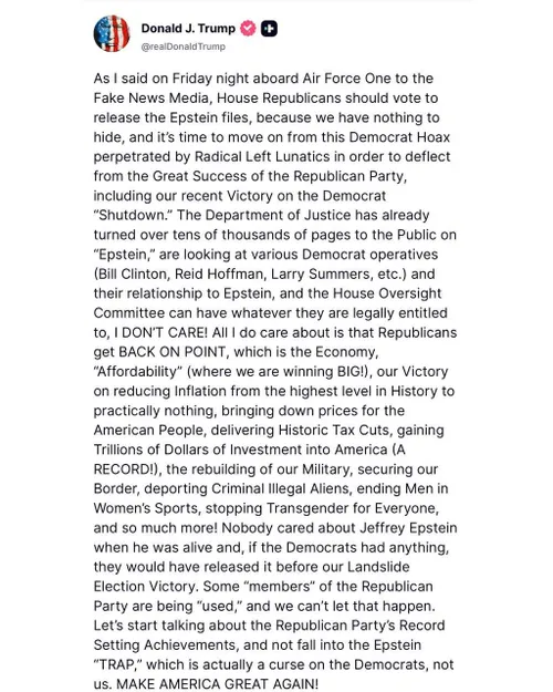 “BREAKING: President Trump calls on House Republicans ‘to release the Epstein files, because we have nothing to hide…I DON’T CARE. All I care about is Republicans getting BACK ON POINT.’ Good! Let’s expose everything, bring justice, expose the dark deeds, and move on stronger.”