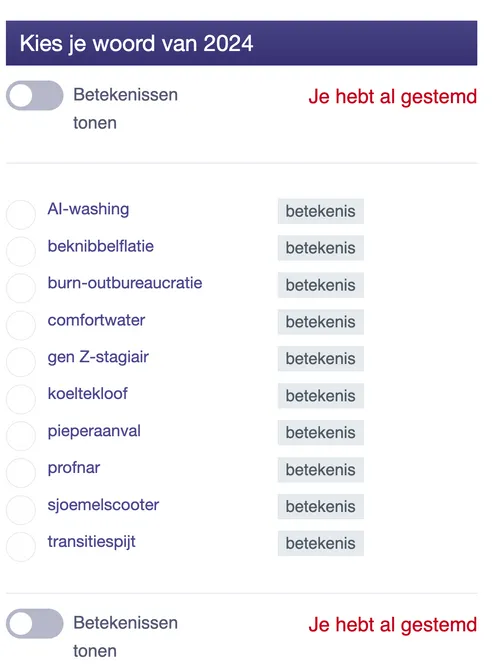 Woord van Het Jaar. Ze hebben geen enkel probleem met 9 van de 10 woorden... maar het laatste (tiende) woord vinden ze echt heel erg. Dat is namelijk "transitiespijt."