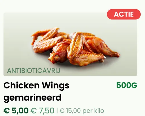 500 gram wings voor slechts 5 euro (normaal 7,50 euro). Chickenwings gemaakt van echte Nederlandse kippen. Kippen die een goed leven gehad hebben, die door hun boeren op een goede manier behandeld zijn, en die altijd gezond voer gehad hebben. Met dds als code gaat er nog eens 10% af. Heerlijk én goedkoop. Mooier dan dat kunnen we het niet maken.