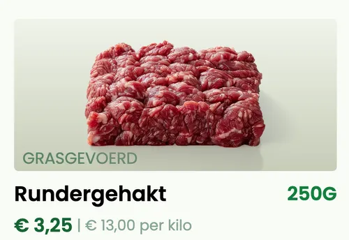 Het beste rundergehakt - van echte Nederlandse koeien - koop je al voor 3,25 euro (voor 250 gram, 13 euro per kilo). Let wel, dit gehakt is afkomstig van koeien die een goed, mooi leven hebben. Ze krijgen écht gras gevoerd, krijgen goed de ruimte om rond te lopen, en ze worden niet verpest met allerlei geïnjecteerde hormonen en vaccins. Nogmaals, met de code dds betaal je nog eens 10% minder. Yes, baby!