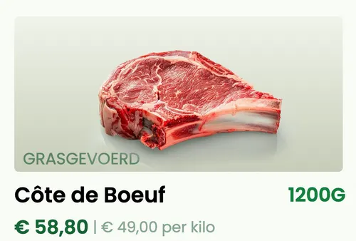 Cote de Boeuf van Eerlijk Eten. Dit heerlijke stuk vlees is óók gemaakt van échte Nederlandse koeien die hun hele leven lang grasgevoerd zijn. Geen rare toevoegingen, geen kunstmatige vetgemeste dieren. Het is heerlijk, mals, en ook nog eens gezond. Zoals we gewend zijn van onze eigen boeren. 49 euro per kilo… maar voor onze lezers slechts 44,10 euro.