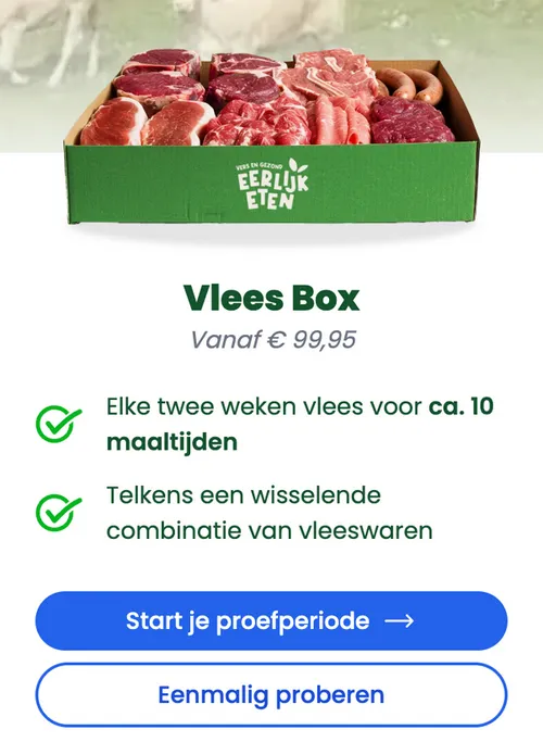Vleesdozen zijn al te verkrijgen voor 99 euro… Oh, en wat ook geweldig is: je kunt nu eenmalig proberen. Je zit dan nergens aan vast. Gewoon de “eenmalig proberen” optie selecteren en je kunt heel makkelijk testen of je het wat vindt, zo’n box. Ook nu geldt: selecteer kortingscode dds en ontvang 10 euro korting.