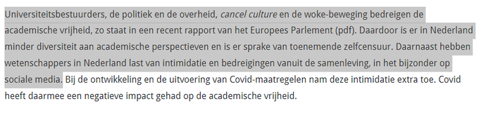 De academische vrijheid in Nederland staat onder druk, zo blijkt uit een recent onderzoek van het Europees Parlement schrijft ScienceGuide. Het rapport wijst op verschillende factoren die bijdragen aan deze ontwikkeling, waaronder universiteitsbestuurders, de politiek, wetenschapsfinanciers, slechte arbeidsvoorwaarden en de woke-beweging. Vergeleken met andere EU-landen presteert