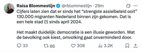 “Cijfers laten zien dat er sinds het ‘strengste asielbeleid ooit’ 130.000 migranten Nederland binnen zijn gekomen. Dat is een hele stad (!) sinds april 2024.”
