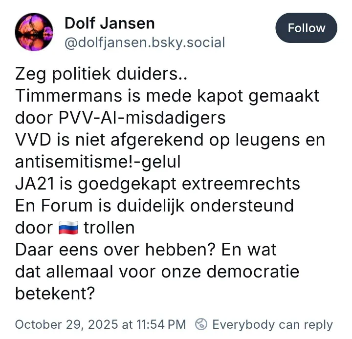 Zijn post is geen grap, geen satire, maar pure minachting voor miljoenen Nederlanders die zich zorgen maken over hun land.