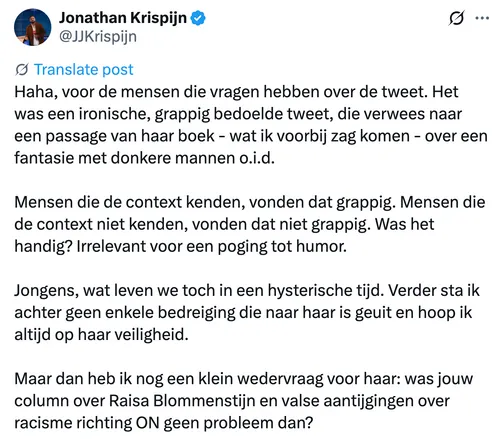 Wat opvalt: De Telegraaf speelt hier volop mee in het slachtofferframe. Het ‘rechtsere geluid’ dat de krant ooit vertegenwoordigde is hier ver te zoeken. In plaats van feiten benoemen, context bieden of balans aanbrengen, wordt Krispijn direct weggezet als fout en bizar. Terwijl hij nota bene zélf in een vervolgtweet uitlegt dat zijn opmerking een ironische reflectie was op Gül's eigen stijl.