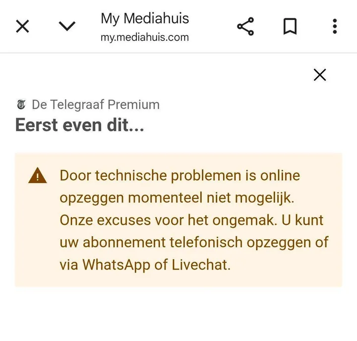 "De telegraaf opzeggen kan via WhatsApp nummer 0888242424. Vergeet niet uw klantnummer te vermelden".
