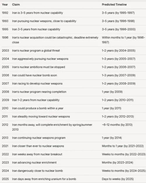 De beweringen begonnen in 1992: “Iran is 3-5 jaar verwijderd van nucleaire capaciteit.”