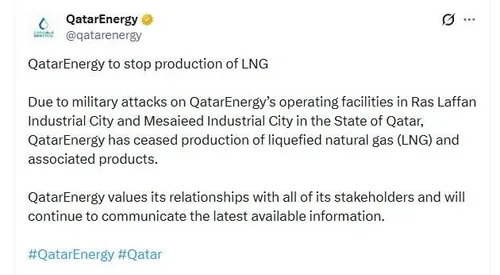 energie-ader van het Westen doorgesneden. Staatsbedrijf QatarEnergy gooide vandaag een officiële en ronduit angstaanjagende verklaring naar buiten op sociale media. Ze melden dat ze de "productie van vloeibaar