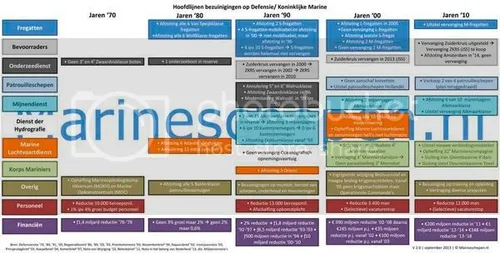 De belangrijkste bezuinigingen en bezuinigingsmaatregelen op Defensie en de Koninklijke Marine gedurende 1971 - 2013.