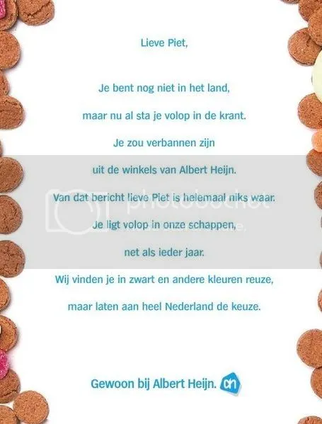 De Telegraaf komt vandaag met het bericht dat de Albert Heijn een charmeoffensief is begonnen om de rel rond Zwarte Piet te sussen. Het wapen dat de supermarkt gebruikt? Een gedicht.