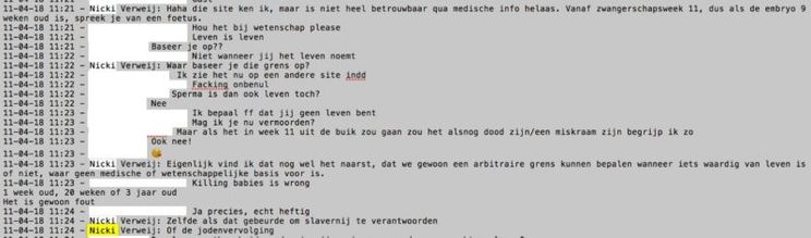 Maar dat waren niet de enige opmerkelijke berichten van Nicki Pouw-Verweij in de appgroep (waarvan ze nu beweert geschrokken te zijn dat er soms zeer walgelijke uitspraken in gedaan werden door anderen). Nee. Mevrouw had ook het één en ander te zeggen over abortus en over de holocaust.