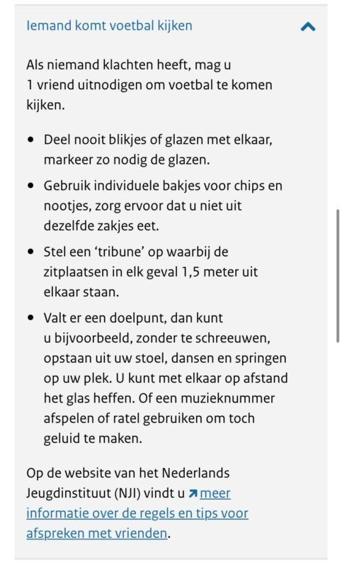 Op Rijksoverheid.nl leggen de boven-ons-gestelden uit hoe wij voetbal mogen kijken met een vriend. De 'tips' zijn ongelooflijk. Het belangrijkste voorbeeld? "Valt er een doelpunt, dan kunt u bijvoorbeeld, zonder te schreeuwen, opstaan uit uw stoel, dansen en springen op uw plek." Dit is dus