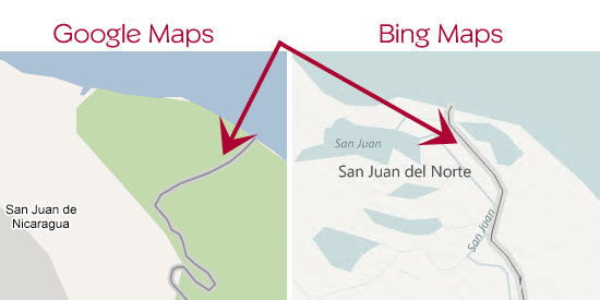 legerloze Costa Rica. De Nicaraguaanse kolonel en oud-rebellenleider die de invasie aanvoerde, zocht eenvoudigweg op Googlemaps op tot waar hij zijn troepen kon laten oprukken. Google zelf had even vergeten rekening te houden met de gespannen voet waarop Nicaragua en Costa Rica al decennia met elkaar leven over dit gebied, en had tot overmaat van ramp ook nog eens het stuk grond onterecht aan de dictatoriale bovenbuur van Costa Rica toegekend. Oeps!