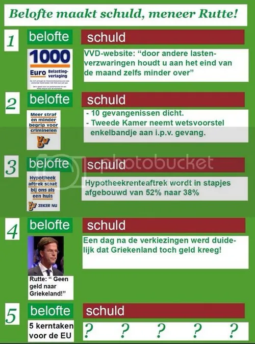 Zo is het maar net. Rutte lijkt verdacht veel op een pathologische leugenaar. Je kunt er vergif op innemen dat als hij het ene zegt, hij het andere doet. Als de EU zich volgens hem moet beperken tot 'vijf kerntaken' weet je dus dat hij Nederland met huid en haar wil uitleveren aan Brussel.