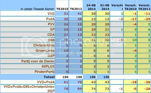 Bij de Europese Parlementsverkiezingen haalde D66 3% meer stemmen dan de VVD, terwijl bij de Tweede Kamerverkiezingen de VVD nog bijna 20% groter was dan D66. Die situatie is sinds eind juli volledig veranderd. De VVD kiezers zijn beduidend positiever over Rutte. Daardoor raakt de VVD in de peilingen veel minder kiezers kwijt aan D66 dan 2 maanden geleden.