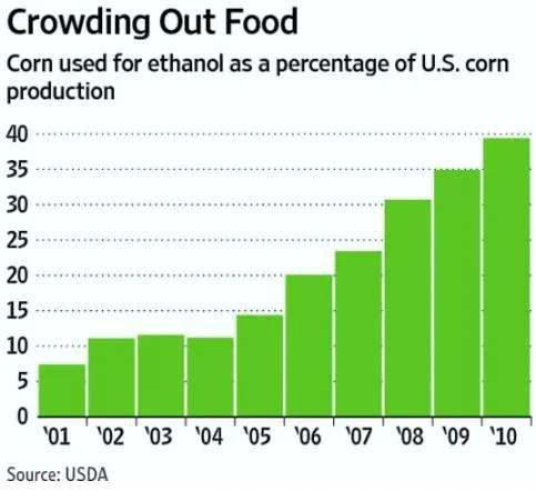 Een deel van dat graan werd altijd al gebruikt als veevoer voor varkens en kippen, maar steeds meer graan dat vroeger werd geëxporteerd, wordt nu omgezet in biodiesel.