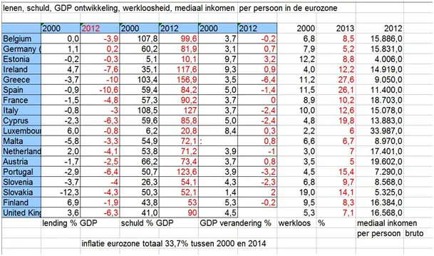 Vergelijk de kolommen voor 2000 en 2012 en zie de verschillen en trek zelf uw conclusies. Is er geharmoniseerd en geintegreerd of is er juist minder harmonie en zijn er grotere verschillen? Zijn de lidstaten naar elkaar toegegegroeid of juist verder uiteen gedreven? Is de ontwikkeling zodanig dat men op dezelfde voet verder kan gaan of leidt een verder zo doorgaan tot nog grotere verschillen en moet een andere weg worden ingeslagen? Het staat niet in de sterren maar in de cijfers die ook welsprekend kunnen zijn. In ieder geval kan niemand zeggen dat het sinds 2012 er voorspoediger op is geworden.