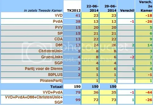 Voor ons is de voortdurende vernedering van de PvdA natuurlijk reden voor een feestje, maar jammer genoeg staat daar tegenover dat D66 daar van profiteert. Tovenaar Alexander en zijn vrienden staan nu virtueel op maar liefst 26 zetels. Ja, dat leest u goed: zesentwintig. De VVD staat op 23, het CDA op 22, de SP op 21 en de PVV - tenslotte - op 20. Het verschil tussen de nummers 2 tot en met 5 is dus te verwaarlozen, maar D66 gaat langzamerhand toch wel behoorlijk ruim op kop. Drie zetels valt niet eens bijna binnen de foutmarge, namelijk.