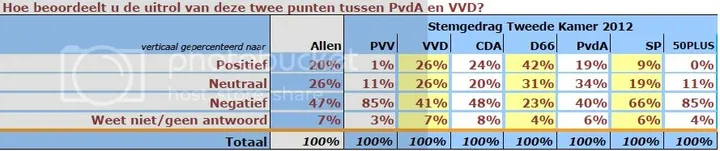De meerderheid (63%) van de PvdA-kiezers is tegen strafbaarheidsstelling van illegalen terwijl de meerderheid van de VVD-kiezers (77%) er voor is De meerderheid (74%) van de VVD-kiezers is voor het verlagen van de belasting voor de middeninkomens, terwijl de meerderheid van de PvdA-kiezers (60%) er tegen is. De uitruil van deze twee maatregelen tussen PvdA en VVD heeft electoraal nadelig gewerkt voor beide partijen, omdat de kiezers blijkbaar het erger vinden wat de twee partijen hebben opgegeven dan wat ze binnen hebben gehaald.