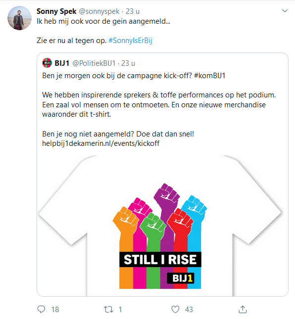 Ex-FvD'er en raadslid namens de lokale Katwijkse partij DURF Sonny Spek twitterde dat hij werd geweigerd bij de ingang van het evenement van BIJ1. De partij van Sylvana Simons trapt namelijk vandaag de landelijke campagne af met dit evenement, onder de hashtag #kombij1, maar het is wel een 'safe space', dus andersdenkenden komen er niet in! BIJ1 lanceerde vandaag de landelijke campagne om de Tweede Kamer in te komen bij de volgende verkiezingen. Op een platform van 'radicale gelijkwaardigheid', diversiteit,