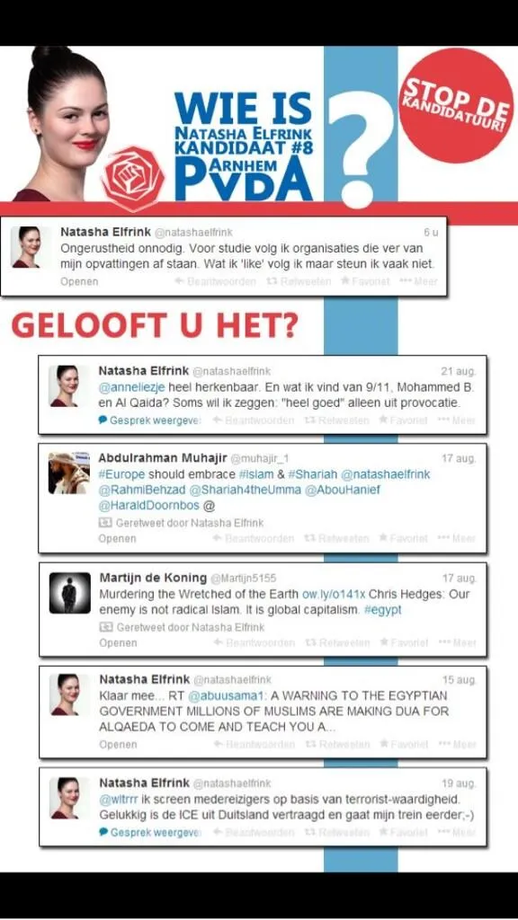 Zolang een persoon het socialistische ideaal niet verloochent tolereert de PvdA alles. Dit wordt bewezen door de Arnhemse afdeling van de salonsocialisten. Daar staat namelijk ene Natasha Elfrink op de lijst. Niets mis mee zou u zeggen? Lees en huiver! Mufti Menk