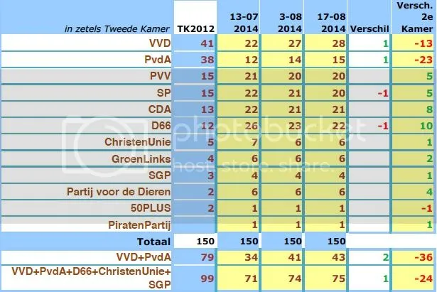 Kijk eens rustig naar die cijfers: in één maand tijd is de VVD van 22 virtuele zetels naar 28 gegaan. De PvdA heeft ook drie virtuele zetels winst geboekt, waardoor de coalitie opeens op 43 virtuele zetels staat. Natuurlijk is dat nog altijd veel minder dan de coalitie nu heeft, maar je ziet de bui al hangen: als de PvdA en VVD een tijdje doorgaan komt het prima in orde voor ze.