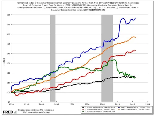 Veel hoeft aan dit staatje niet te worden toegevoegd. De bierprijs in Griekenland is sinds 1996 bijna verdubbeld, Ierland herstelt zich na haar bail-out blijkbaar zelfs beter dan het credits voor krijgt, en de Duitse consument zag zijn biertje sinds 1996 nauwelijks duurder worden. Opvallend is overigens dat de bierprijs in Italië sneller stijgt dan in Spanje, al zou het kunnen dat deze in Italië in 1996 extreem laag lag. De Nederlandse bierprijs is in de afgelopen 15 jaar ook nauwelijks gestegen. Wat dat betreft zitten we economisch inderdaad nog steeds in het zog van de Duitsers.