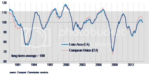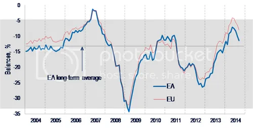 Het consumentenvertrouwen daalde voor de vierde maand op rij, onder andere door de blijvend hoge werkloosheid, de lage spaarrentes en de algehele economische situatie in de eurozone. De Commissie schrijft: