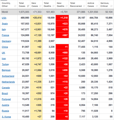 The Johns Hopkins University, die alle cijfers met betrekking tot corona bijhoudt, meldt zojuist dat het aantal coronadoden de 100.000 is gepasseerd. Italië, Spanje en Amerika zijn tot nu toe het hardst getroffen. Frankrijk is wat dat betreft ook hard op weg en rapporteerde vandaag bijna duizend nieuwe sterfgevallen. De laatste paar dagen heb ik helemaal niet meer zoveel gelet op dagelijkse cijfers van