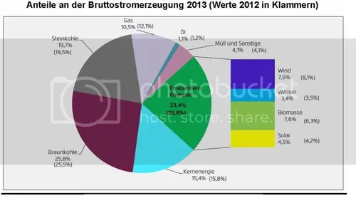 Bovendien werd van het totale stroomverbruik in 2013 nog slechts 23,4% door renewables gedekt en de rest werd verzorgd door de fossiele brandstoffen en kernenergie. Wel een verhoging van het renewable deel met 0,6% vergeleken met 2012 zoals blijkt uit de volgende grafiek.