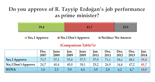 impopulair te worden. Volgens Metrolpoll keurt slechts 39,4% van het Turkse electoraat zijn beleid op dit moment goed.