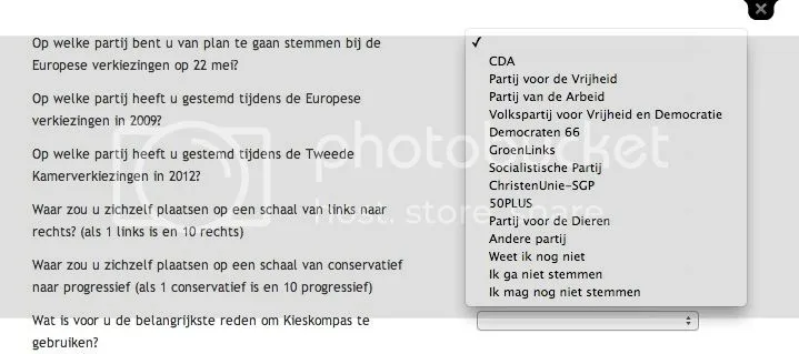 Bovenstaand screenshot laat duidelijk zien dat u hooguit voor 'Andere partij' kunt kiezen. Het is de zittende kliek of iets 'anders,' maar wat precies blijft onduidelijk. Sterker nog, tot eerder vandaag stond zelfs die optie er niet bij. Na de storm van kritiek heeft Kieskompas snel nog even de mogelijk tot 'anders' stemmen toegevoegd, maar om die andere partijen bij naam te noemen was blijkbaar te veel moeite.