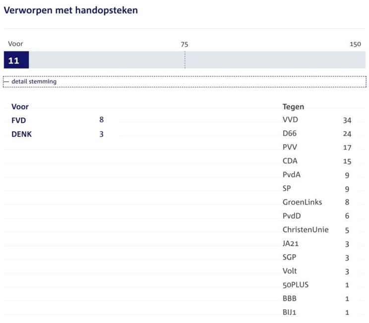 De resultaten van de stemmingen over beide moties was dat ze met overweldigende meerderheid verworpen werden. De uitslag van de twééde motie, dus tegen het invoeren van een vaccinatiepaspoort was: 40 stemmen voor de motie 110 tegen.