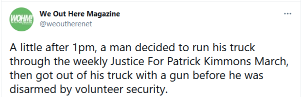 Afgaande op onderstaande tweet gaat het om een protestmars genaamd 'Justice For Patrick Simmons' en is de automobilist juist het probleem. Zij omschrijven de militante activisten als 'vrijwillige beveiligers':