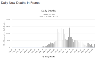 In deze grafiek van worldometers.info over het Franse sterftecijfer, is te zien hoe men de laatste weken steeds twee stappen vooruit zet, en één stap terug doet. Telkens komt er weer zo'n piek, een toename van soms wel 100 procent. Waarschijnlijk is dit eenzelfde patroon als bij de 'dinsdagpiek' in Nederland. En om die reden is het des te meer opmerkelijk dat men twee dagen op rij een stijging meemaakt van een meer dan een paar honderd procent! Van 243 omlaag naar 80. De dag erna naar 70. Maar dan ineens 263, opgevolgd met 348.