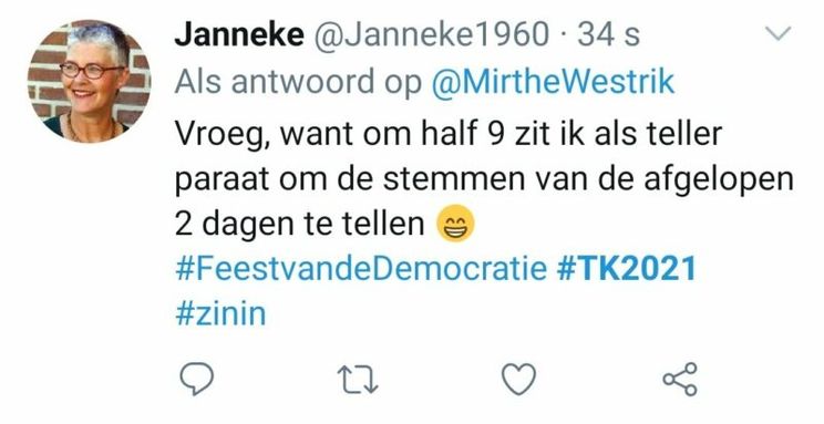 Een twitteraar uit Amersfoort laat heel blij weten dat ze vandaag stemmen gaat tellen. Feest van de democratie, en zo. Alleen is het wel een beetje merkwaardig dat deze zelfde dame een geschiedenis heeft van het bashen van FVD. "Als je daar willens en wetens op stemt of mee samenwerkt ben je af," schreef ze onder meer. En: "ik walg van de intenties van een partij als FVD." Afgelopen zondag liet ene Janneke weten dat ze woensdag als teller gaat "helpen bij de verkiezingen." Het wordt, schreef ze, de "eerste keer dat ik dat doe; geen idee eigenlijk waarom ik dat niet eerder heb gedaan. Lijkt me leuk en leerzaam. Het is overdag wanneer de lijsten van maandag en dinsdag worden geteld."