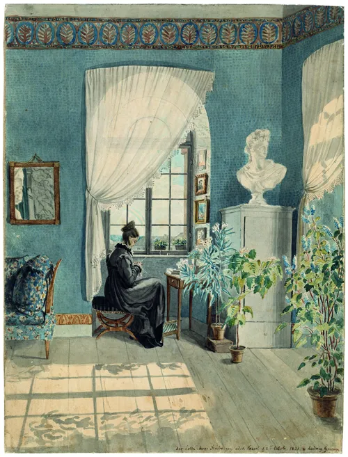 © Engelbert Seehuber, München. Ludwig Emil Grimm, Charlotte Amalie Grimm in ihrem Zimmer am Wilhelmshöher Tor, 1821, Aquarell über Bleistift; 32,5 x 24,3, Privatbesitz