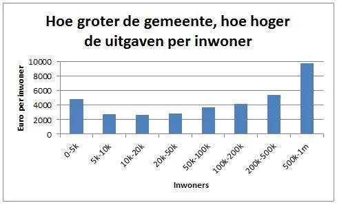 Afgezien van hele kleine gemeentes is er een direct verband tussen uitgaven en grootte: Hoe groter hoe duurder.