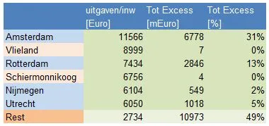 Van de gemeentes die meer dan 6000 euro per inwoner verbranden, zes in totaal, zijn er twee heel klein en vier heel groot. Het exces - het verschil tussen wat ze uitgeven en wat de modale gemeente uitgeeft per inwoner - is voor de kleine gemeentes in totaal 11 miljoen, terwijl de vier grote gemeentes ruim 11 miljard teveel uitgeven. Daarboven op komt nog dat gemeentes als Vlieland en Schiermonnikoog niet veel efficiënter kunnen. Hun kostenpatroon komt doordat ze een eiland zijn, niet doordat ze te klein zijn.