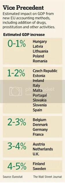 We hebben ook altijd verwaarloosd dat er lieden zijn die er illegale activiteiten op na houden, drugshandel bijvoorbeeld en niet te vergeten de illegale prostitutie. Ook daarvan worden in het vervolg de geschatte inkomsten meegenomen in het BBP, naar schatting levert dat zo'n 3 à 4% op volgens eurostat.