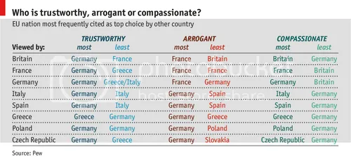 Dat uniformiteitsstreven van de EU druist volgens Streeck in tegen wat de volken van Europa zelf willen. Niet alle Europeanen willen Duitsers zijn, maar vooral zichzelf. In onderstaande afbeelding is te zien hoe Europeanen over zichzelf en andere Europeanen denken. Vooral opvallend is de zelfkennis van de Italianen over hun eigen betrouwbaarheid: