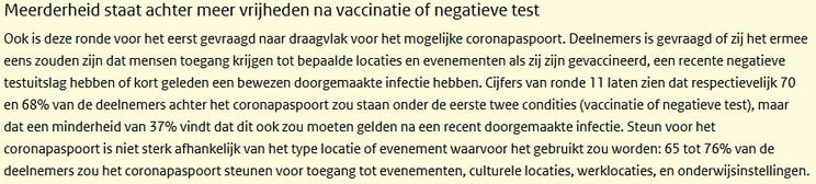 Het heeft er dus alle schijn van dat het RIVM doelbewust de zaak zo aan het verdraaien is dat het lijkt alsof er een enorm draagvlak onder de Nederlandse burger is voor een vaccinatiepaspoort als toegangsbewijs, terwijl dat helemaal niet zo is. Heel doortrapt dit.