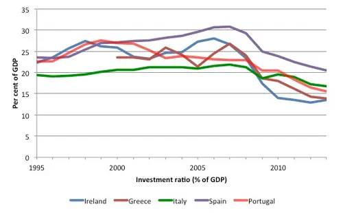 Dit is een belangrijke constatering, die bevestigt dat de muntunie niet werkt en dat 'geld' als zodanig geen economische groei aanzwengelt, maar het perspectief dat ondernemers en bedrijven zien in de toekomst. Het S&GP is desastreus gebleken voor de investeringen van de private sector in de getroffen landen. Klaarblijkelijk vinden ondernemers die toekomst van de eurozone als geheel zwak, en daar hebben ze natuurlijk ook alle reden toe. In onderstaande grafiek is te zien, dat in de zwakke eurolanden de investeringen, uitgedrukt als percentage van het BBP, zijn gedaald na het uitbreken van de crisis: