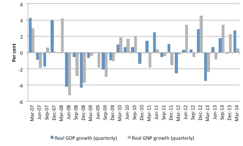 Ierse Nationale Begroting. Vorige week donderdag presenteerde het CSO (Irish Central Statistics Office) de cijfers van het eerste kwartaal van 2014, waarin zij een kwartiele groei lieten zien van 2,7% (dus van Q4 van 2013 naar Q1 van 2014), terwijl het Ierse BBP maar met 0,5% toegenomen was. Klaarblijkelijk is de hoge groei van Q1 niet (volledig) aan de Ierse economie ten goede gekomen. Het CSO meldt: