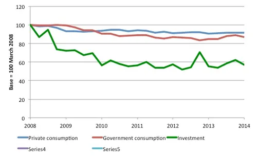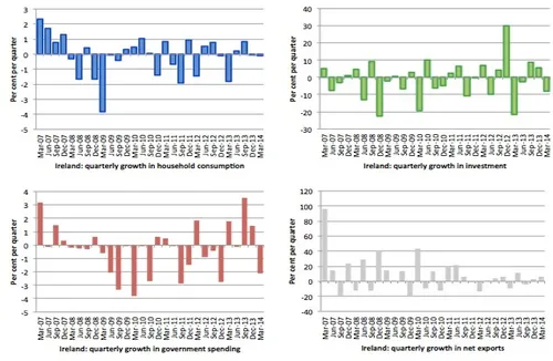 "Net exports made a positive contribution of 541m in volume terms on a seasonally adjusted basis between Q1 2014 and Q4 2013. Personal expenditure was largely unchanged, declining by 0.1 per cent. Capital Investment decreased by 8.1 per cent. Government expenditure also decreased by 2.1 per cent."